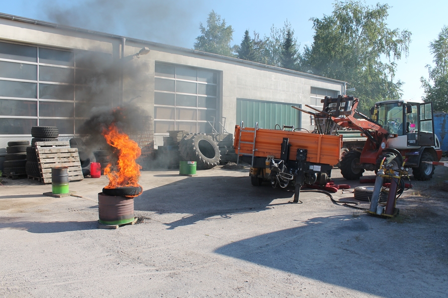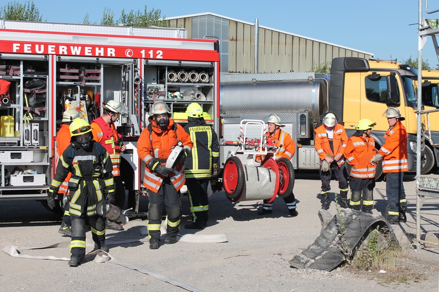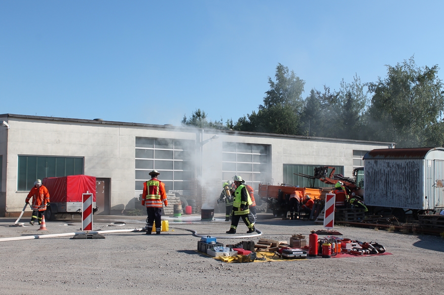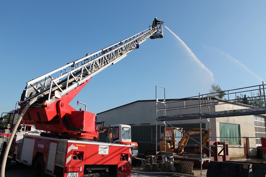 Im Umfeld zur Unfallstelle war es Aufgrund des Unfalls durch einen nicht abgestellten Schweißbrenner zu mehreren kleineren Bränden auf dem Firmenareal gekommen, die bis zum Eintreffen der Feuerwehr bereits auf Teile einer Fahrzeughalle übergegriffen hatten. Der Löschzug stellte zunächst den Brandschutz an der Unfallstelle, sowie für die Verletzten und Rettungskräfte sicher. Im weiteren Verlauf löschten die eingesetzten Trupps die Brände auf dem Betriebsgelände an der Unfallstelle und an der Fassade der angrenzenden Halle. Die Drehleiter kümmerte sich um kleinere Brände im Dachbereich der Fahrzeughalle und kühlte die Dachhaut.