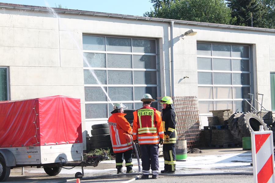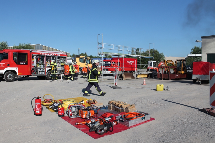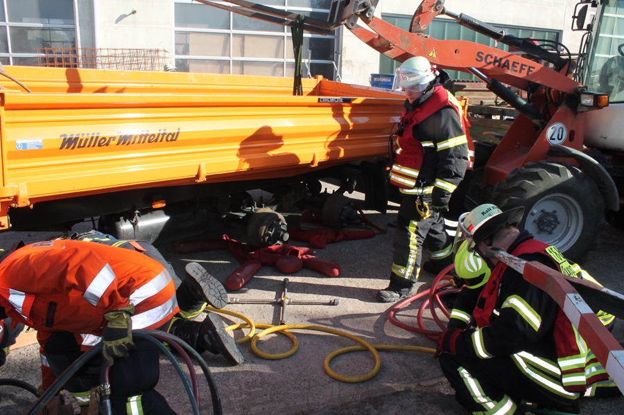 Bei Instandsetzungsarbeiten an einem Lkw-Anhänger in einem Unternehmen im Seesener Industriegebiet, war es zu einem folgeschwerem Unfall mit Personenschaden gekommen. Wie der Besitzer der Firma den Einsatzkräften berichtete, war er vor dem Unfall damit beschäftigt an einem Anhänger Reparatur- und Schweißarbeiten durchzuführen. Der Hänger war aufgebockt und an ihm waren zwei Reifen demontiert. Für diese Tätigkeiten war auch ein Radlader im Einsatz. Auf dem Fahrersitz des Radlader saß der minderjährige Sohn des Firmeninhabers. Offensichtlich hat der Sohn bei laufendem Motor an einem Bedienhebel gezogen, der Radlader fuhr nach vorne und überrollte einen Mitarbeiter des Unternehmens. Darüber hinaus wurden zwei weitere Persinen unter dem Anhänger eingeklemmt und durch ein Schweißgerät war es zu einem Brand gekommen. So das angenommene Szenario für eine Übung der Seesener Kernstadt-Feuerwehr, ausgearbeitet von Ortsbrandmeister Thomas Bettner.