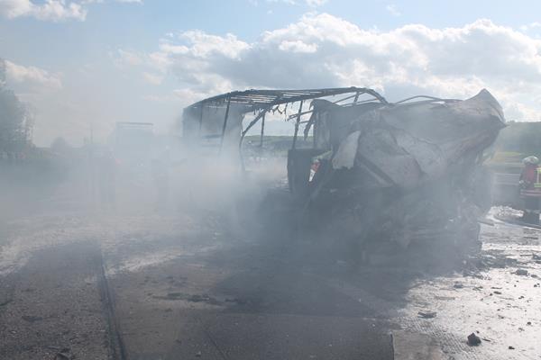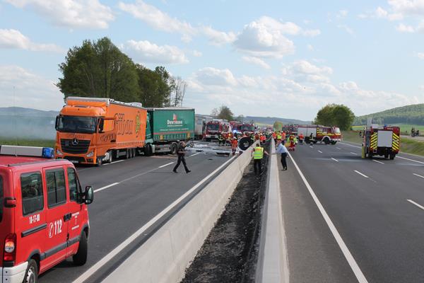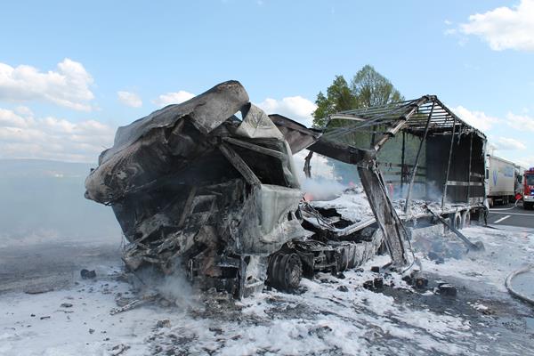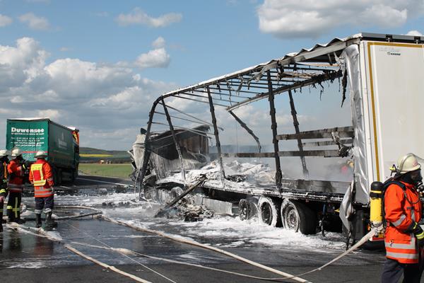 Die Ladung des ausgebrannten Sattelzuges bestand aus 15 Tonnen schweren Coil aus Flachstahl sowie aus neuen und noch leeren Kunststoffflaschen, in die Nasenspray gefüllt werden sollte. Der Lkw, der als erster aufgefahren war hatte fabrikneue Pkw-Getriebe geladen. Auch an diesem Fahrzeug und der Ladung entstand offensichtlich Totalschaden. Einzig der Sattelzug, der am Stauende stand, konnte noch bis zur nächsten Rastanlage weiterfahren, wo er notdürftig repariert wird. Die Polizei schätzt den Schaden auf mindestens 600.000,- EUR.