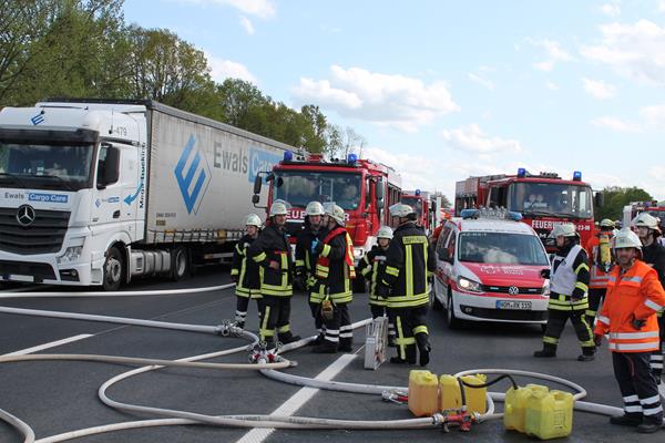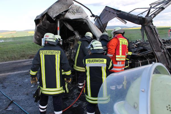 Beim Eintreffen der Seesener Einsatzkräfte stand der dritte Lkw bereits in Vollbrand. Für den eingeklemmten Fahrzeugführer kam jede Hilfe zu spät. Daher galt es zunächst den Brand an dem Sattelzug zu bekämpfen. Es wurden zunächst mehrere Trupps unter Atemschutz mit einem Schaummittel-Löschangriff eingesetzt. Nach dem Ersticken der Flammen wurde das Fahrzeug mittels Wasser heruntergekühlt. Die wasserführenden Fahrzeuge aus Rhüden, Bockenem, Bornum, Münchehof und von der Werkfeuerwehr Crown sorgten für ausreichend Wassernachschub an der Einsatzstelle.