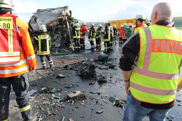 Der Unfall ereignete sich auf der A7 in Richtung Norden zwischen der Abfahrt Seesen und der Raststätte Harz Ost. Am Mittwochnachmittag gegen 15:15 Uhr hatte sich auf der A 7, innerhalb einer Baustelle, in Höhe der Rastanlage Harz-Ost ein leichter Verkehrsunfall ereignet. Aufgrund dieses Vorfalles staute sich der Verkehr auf der Autobahn zurück. Gegen 15:45 Uhr, ungefähr 3 km hinter diesem ersten Unfall, hielt am Stauende ein 53-jähriger Sattelzugfahrer aus Sachsen-Anhalt mit seinem 40-Tonnen-Gespann an. Dieses haltende Fahrzeug bemerkte der Fahrer eines 22-Tonnen-Lkw aus Hessen zu spät und er fuhr nahezu ungebremst auf den den haltenden auf. Nur wenige Sekunden später fuhr ein 33-jähriger Fahrer aus Polen mit seinem 40-Tonnen-Sattelzug auf den gerade selbst aufgefahrenen Lkw auf. Der zuletzt aufgefahrene Sattelzug geriet sofort in Flammen und brannte völlig aus. Nach bisherigen Ermittlungen schlug dessen Ladung, eine schwere Stahlbandrolle (Coil), ins Fahrerhaus und verletzte den Fahrer schwer. Er wurde eingeklemmt und konnte später nur noch tot aus seinem Führerhaus geborgen werden. Der Fahrer des in der Mitte befindlichen Lkw wurde von Ersthelfern aus seinem völlig demoliertem Führerhaus geborgen und wurde schwer verletzt und mit dem Rettungshubschrauber in die Universitätsklinik nach Göttingen geflogen. Der Fahrer des ersten Lkw wurde nur leicht verletzt.