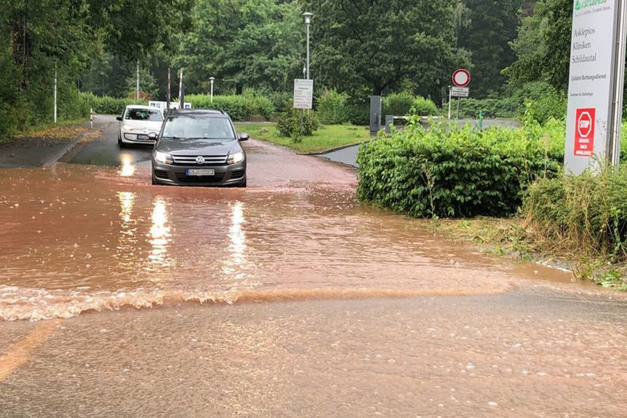 Einen Starkregen von diesem Ausmaß und in einer solchen Konsequenzen hat es in der Geschichte der Klinik bislang wohl noch nicht gegeben. Alarmiert worden war die Feuerwehr Seesen um 15:35 Uhr wegen eines umgestürzten Baums am Sternplatz und Geröll auf der Lautenthaler Straße. Auf dem Weg dorthin hat im Bereich des Kurparks aber bereits das Wasser auf der Straße gestanden, und an der Klinikauffahrt kam den Einsatzkräften das Wasser schon entgegen.