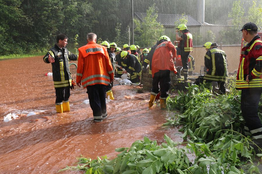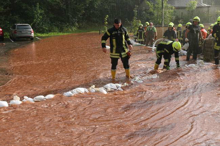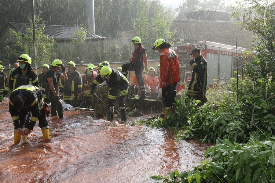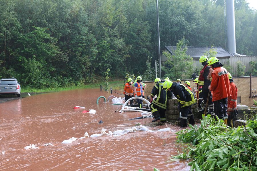 Dem nicht genug, sorgten vor allem die Wassermassen aus dem Wald, die den Hang herunterliefen, für immense Probleme. Die eingesetzten Pumpen, die 7.000 Liter Wasser die Minute fördern, schafften es nicht. Eine Stützmauer, die vor dem Gebäude stand, wirkte als Barriere. Einzige Chance an diesem Tag, die Mauer musste teilweise abgerissen werden, um für Entlastung und für den besseren Ablauf zu sorgen. So griffen die Brandschützer zum Vorschlag- und zum Abbruchhammer. Darüber hinaus wurde eine Sandsackbarriere errichtet.