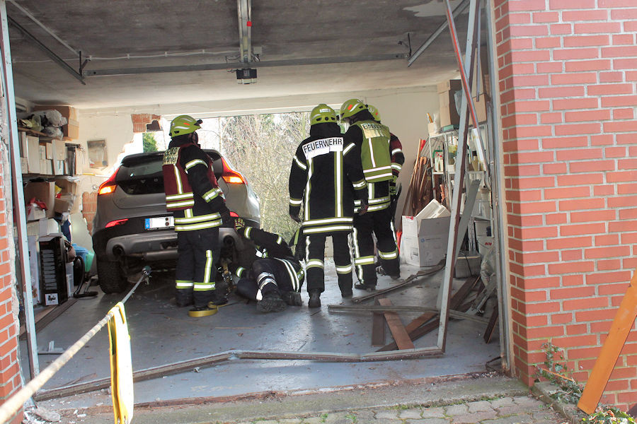 Nach der provisorischen Sicherung des Unfallfahrzeugs wird dieser mit der Winde des Rüstwagens mit allen vier Rädern wieder auf den Garagenboden zurückgezogen und dort endgültig gegen wegrollen gesichert. Der Volvo ist ein Totalschaden und die Garagenrückwand wurden stark beschädigt. Über die Höhe des entstandenen Sachschaden können zum jetzigen Zeitpunkt noch keine Angaben gemacht werden.