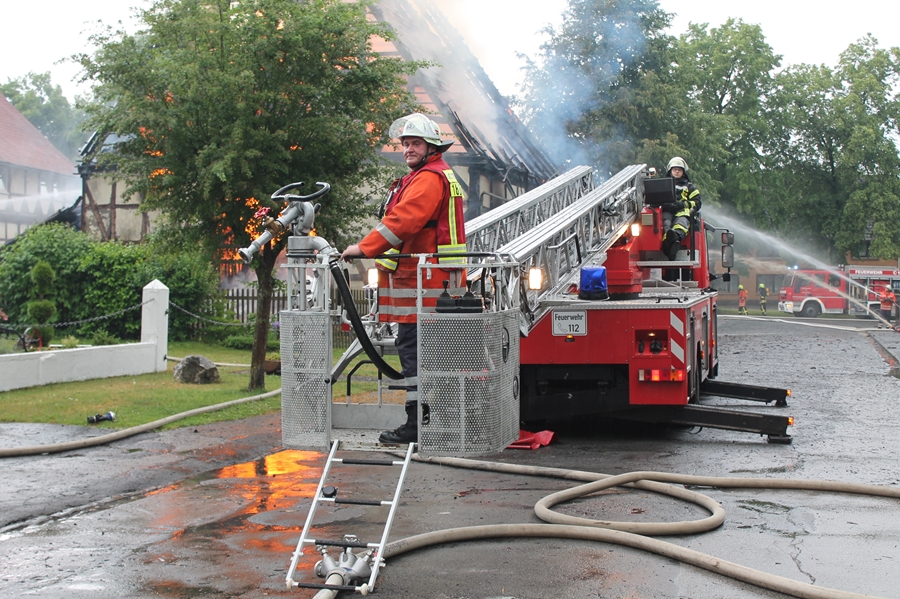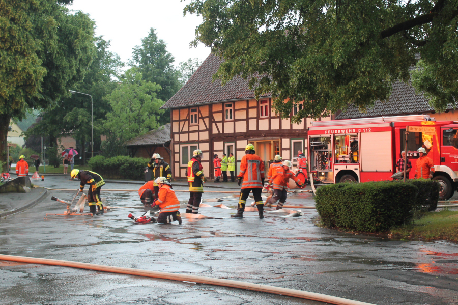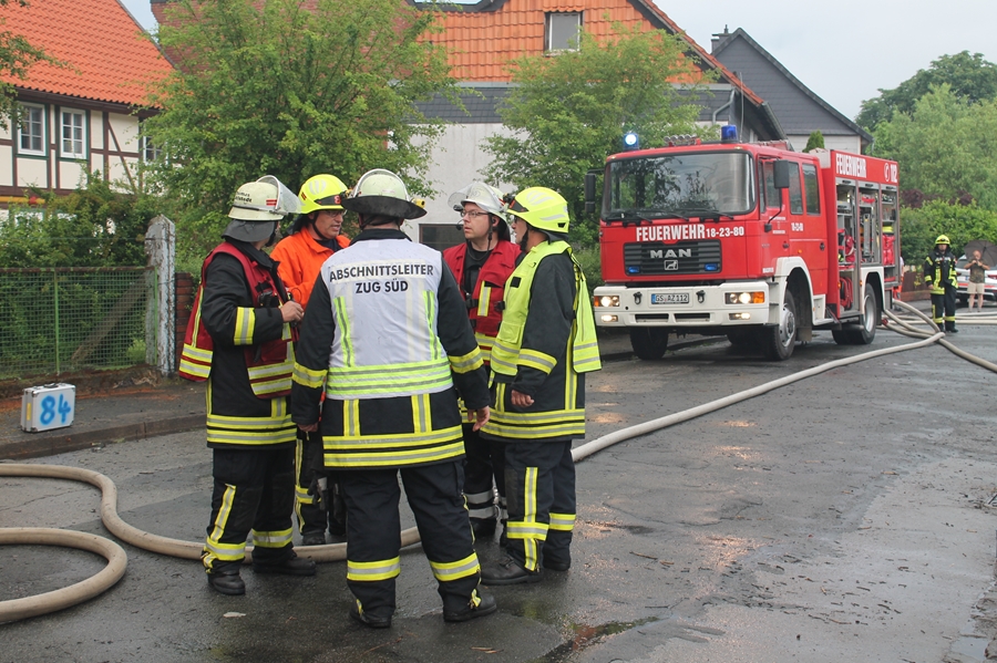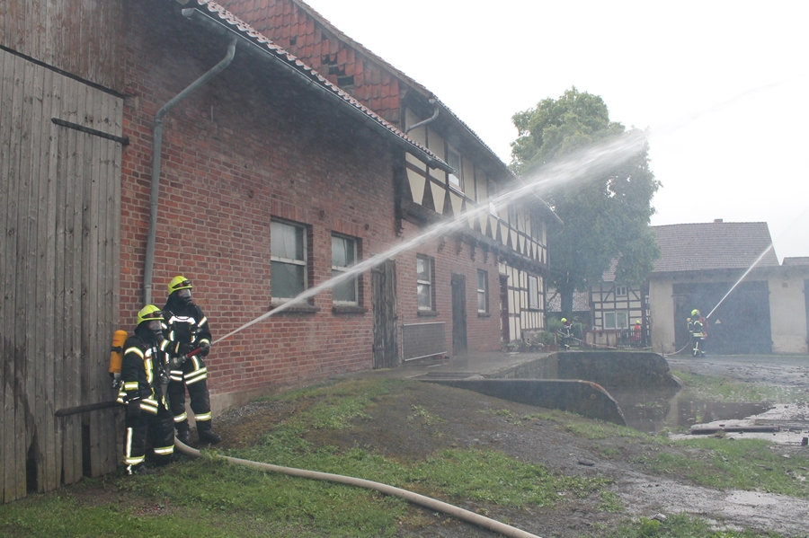 2018 06 01 005Gewitter und starke Regenfälle haben auch im Raum Seesen erneut zu größeren Schäden geführt. Ein Blitzeinschlag löste einen Groß-brand aus. Im Ortsteil Münchehof vernahmen Anwohner ein lautes Krachen, als der Blitz den Dachfirst einer Scheune in der Straße "Im Winkel" traf.