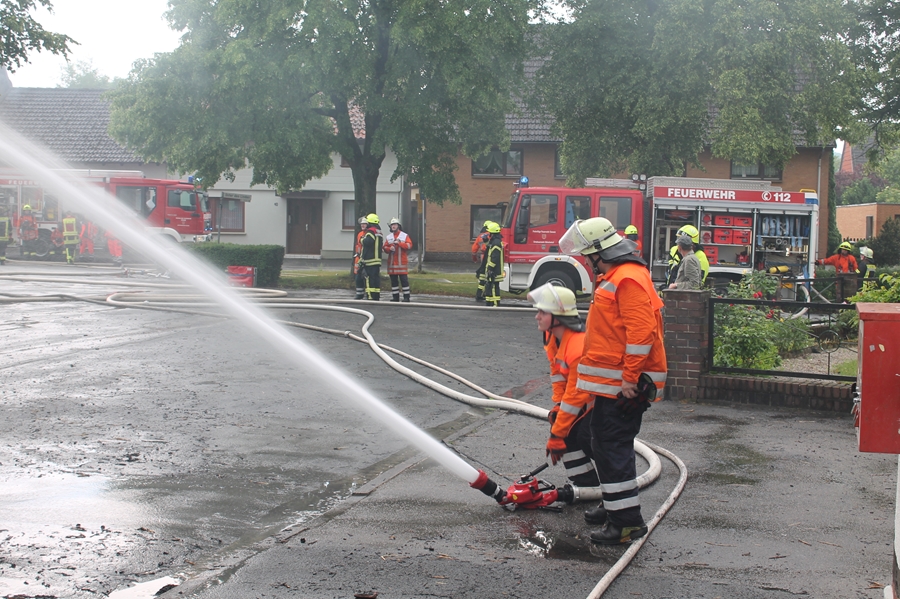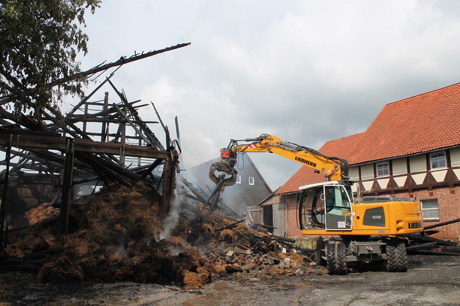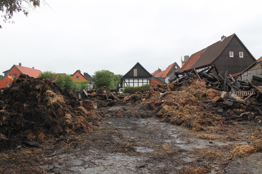 Die rund 140 Einsatzkräfte der Feuerwehren aus Seesen, Herrhausen, Ildehausen, Kirchberg, Münchehof und Rhüden konnten nicht verhindern, dass die ca. 20 x 20 Meter große Scheune völlig abbrannte und auch ein, auf der gegenüberliegenden Straßenseite liegendes, Wohnhaus massiven Schaden nahm. Hier sprangen durch die Hitze die Fensterscheiben, Teile der Fassade schmolzen. Neben der Feuerwehr war der Rettungsdienst, das DRK Münchehof und die Polizei am Einsatzort.