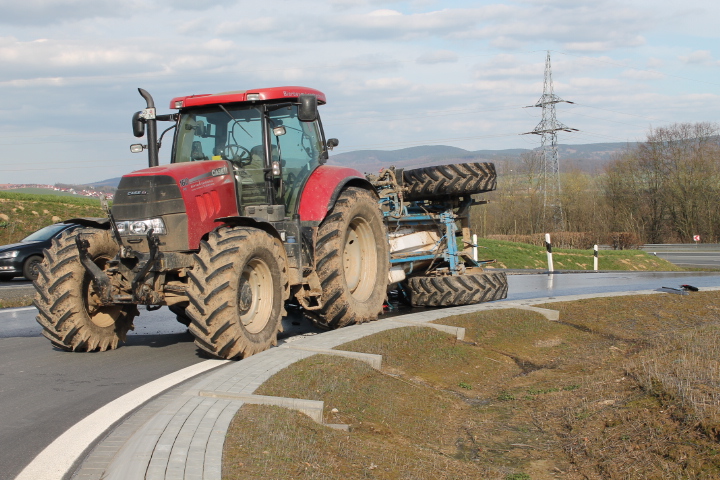 Im Kreisverkehr der B 64 - Feldspritze eines Landwirtes kippt auf die Straße