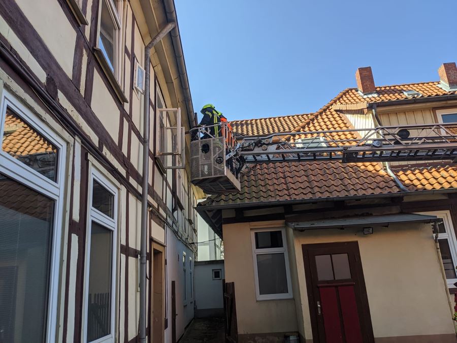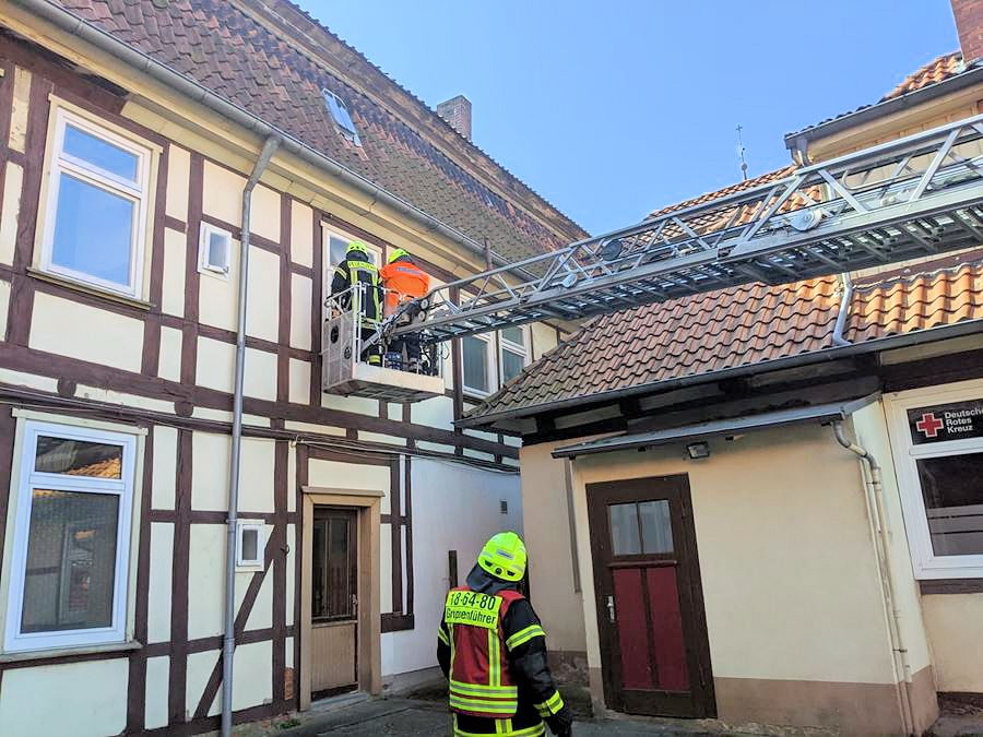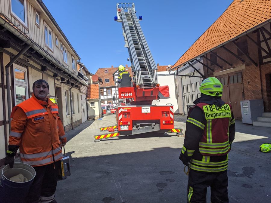 Der letzte Einsatz an diesem Tag erfolgte in der Mittagszeit, kurz vor 12 Uhr. Ein Greifvogel war in ein unbewohntes Gebäude in der Straße "Vor der Kirche 1" geflogen und kam alleine nicht mehr heraus. Mit Hilfe der Drehleiter konnte im 1. Obergeschoss ein Fenster geöffnet werden und der Vogel danach wohlbehalten ins Freie entlassen werden.