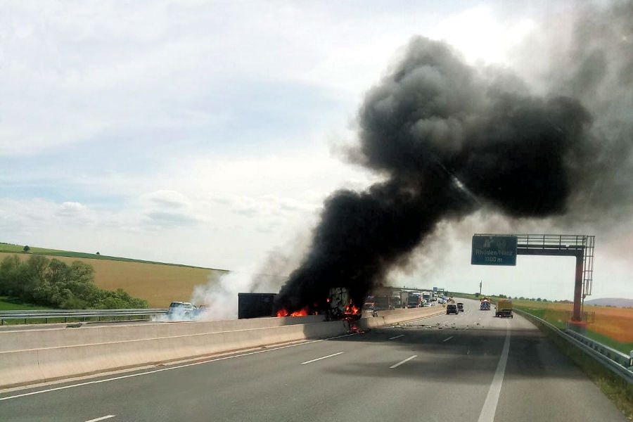 Während der Anhänger auf die Seite gestürzt ist, blieb die Zugmaschine auf der Mittelleitplanke liegen und ragte teilweise in den Gegenverkehr. Dabei ist der Lkw sofort in Flammen aufgegangen. Die dunkle Rauchsäule war schon Kilometerweit sichtbar und verhieß nichts Gutes für die Einsatzkräfte von Feuerwehr, Polizei und Rettungsdienst. Der Unfall ereignete sich ca. 1000 Meter hinter der Autobahnanschlussstelle Rhüden in Fahrtrichtung Norden. Der Auslöser für den Unfall war offenbar ein Skoda Yeti, an dessen Steuer ein 81-jähriger Fahrer saß. Er hatte scheinbar zu knapp vor dem Lkw eingeschert. Dann begann das Unheil. Ein Ausweichmanöver des Lkw-Fahrers misslang, so dass sein 40-Tonner zuerst nach rechts in den Seitenstreifen geriet. Dort touchierte der Lkw die Leitplanke und anschließen zog das Gespann nach links, durchbrach die Mittelbegrenzung aus Beton, kippte auf die Seite und fing Feuer.