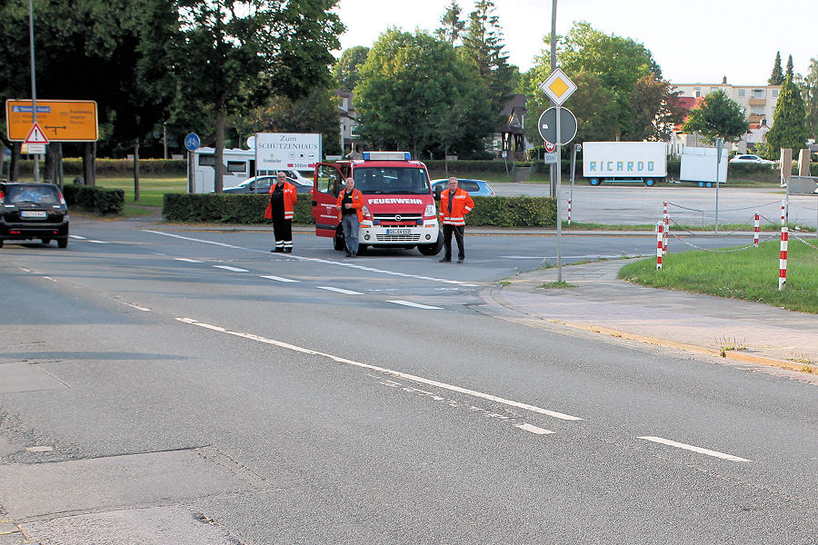 Rund 2,5 Stunden waren die 18 ehrenamtliche Einsatzkräfte damit beschäftigt, den schmierigen Ölfilm auf den Fahrbahnen abzustreuen und somit eine Gefahr für die Verkehrsteilnehmer zu bannen. Zu diesem Zweck wurden mehrere Dutzend Säcke mit Ölbindemitteln auf die Straße aufgebracht. Neben der Feuerwehr waren auch der Baubetriebshof der Stadt sowie die Polizei im Einsatz.