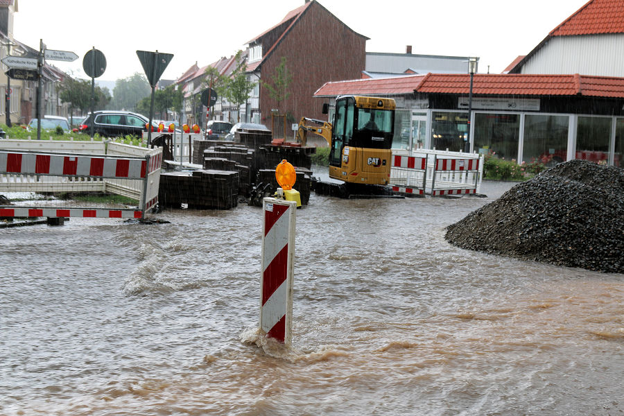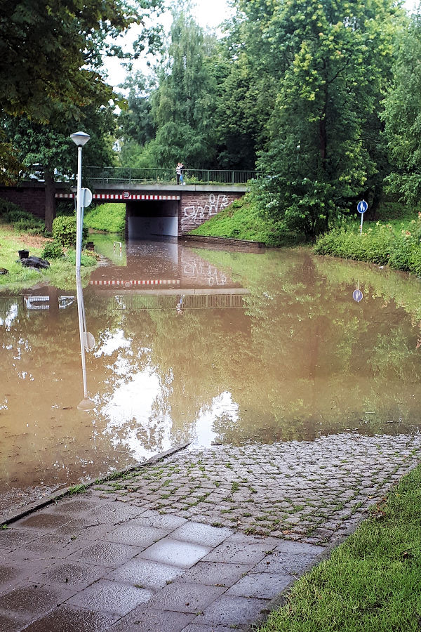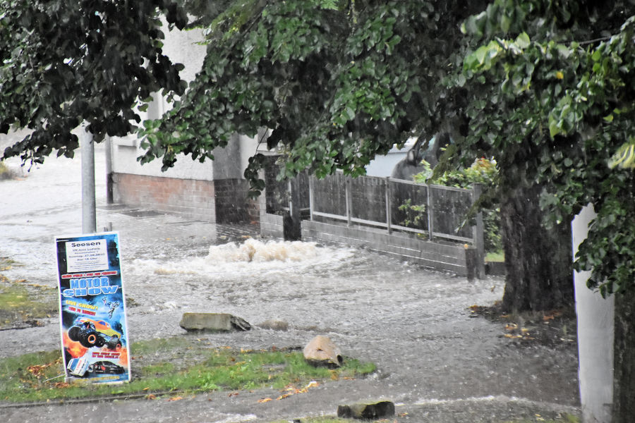 Gegen 14 Uhr wurde es über der Kernstadt von Seesen immer dunkler, es folgte Hagel, sintflutartiger Sturzregen verbunden mit starken Windböen – und dies Szenario setzte Straßen und Keller unter Wasser. Der starke Regen hat an etlichen Stellen, gerade in den Senken, Schmutz angeschwemmt, der dann die Ablaufschächte verstopfte, was zu einem langsameren Abfluss der anfallenden Wassermenge führte. Das war unter anderem in der Straße "An der Masch" wieder einmal der Fall, wo sich in der dortigen Senke unter der Brücke große Wassermassen gesammelt hatten, betroffen waren aber auch zahlreiche andere Straßen im Seesener Stadtgebiet.
