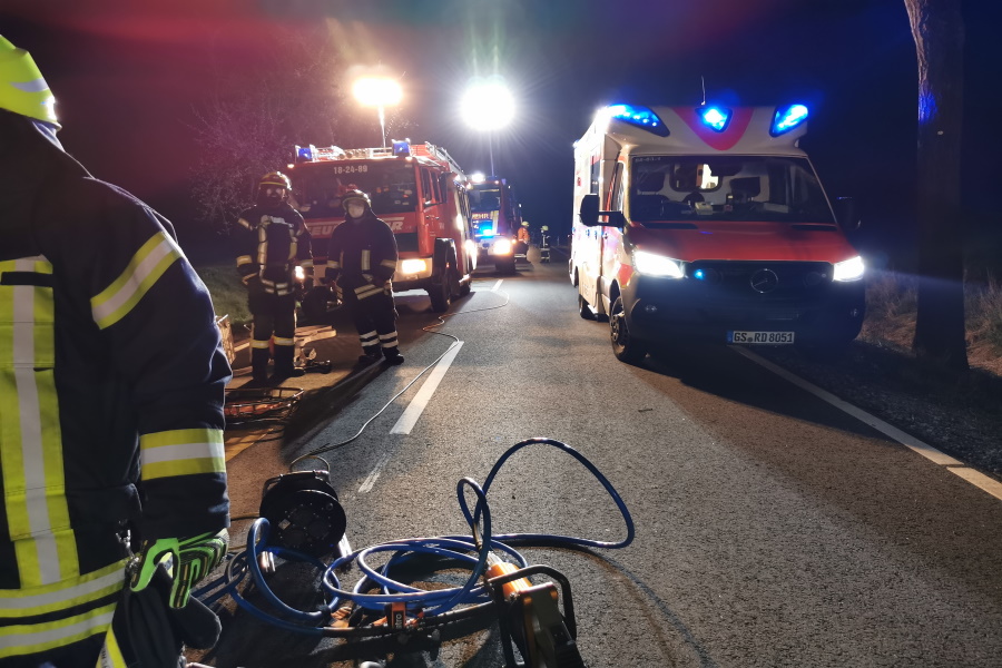 Beim Eintreffen der Seesener und Rhüdener Feuerwehren betreute die ersteintreffende Feuerwehr Mechtshausen bereits die Person im verunfallten PKW. Eine erste Lageerkundung ergab, dass der Fahrer im unteren Beinbereich eingeklemmt war. Bis zum Eintreffen des Rettungsdienstes wurde, wie bei solchen Einsätzen üblich, jeweils ein Ablageplatz von der Feuerwehr Seesen und Rhüden mit technischem und hydraulischem Rettungsgerät aufgebaut.