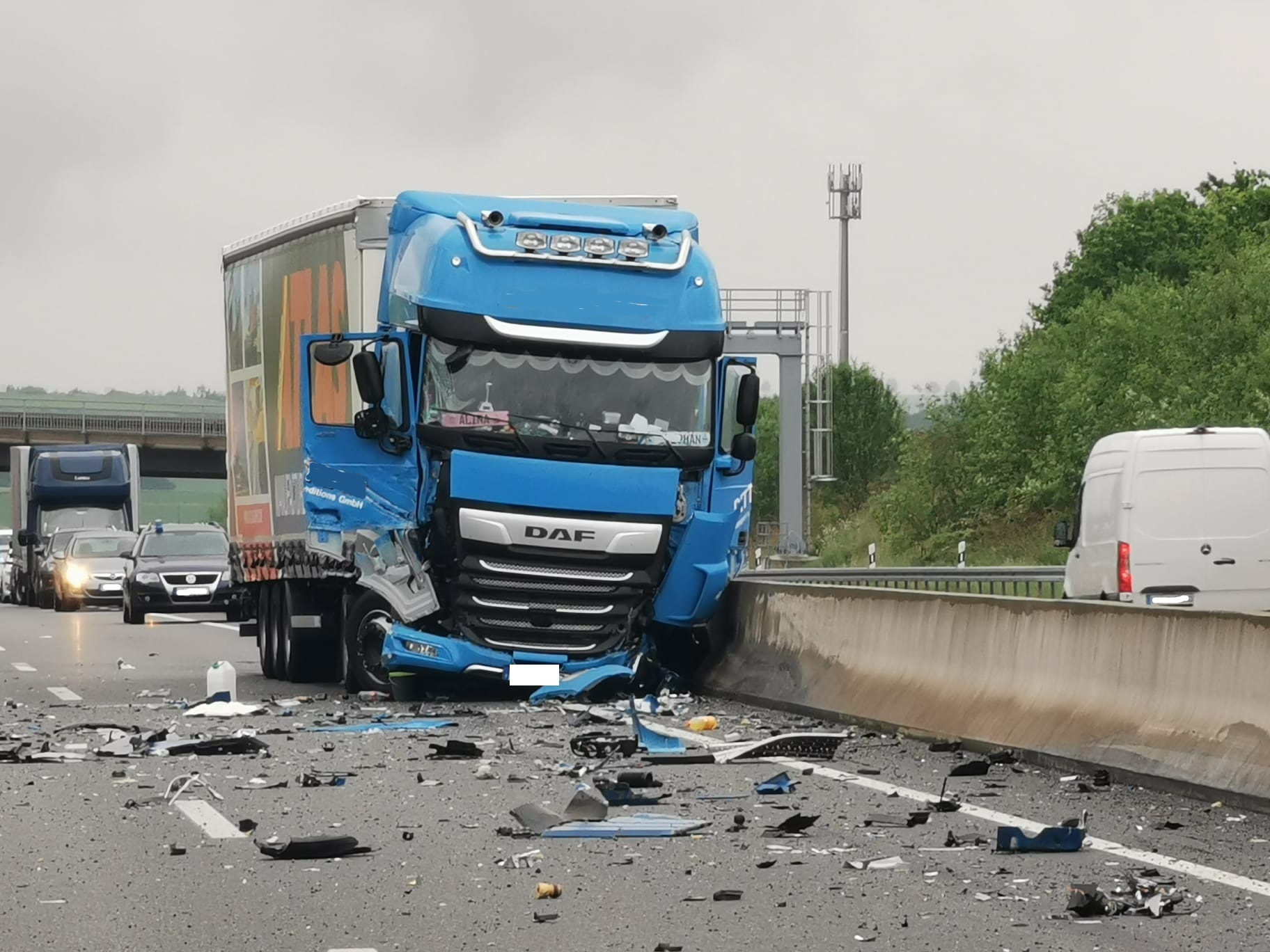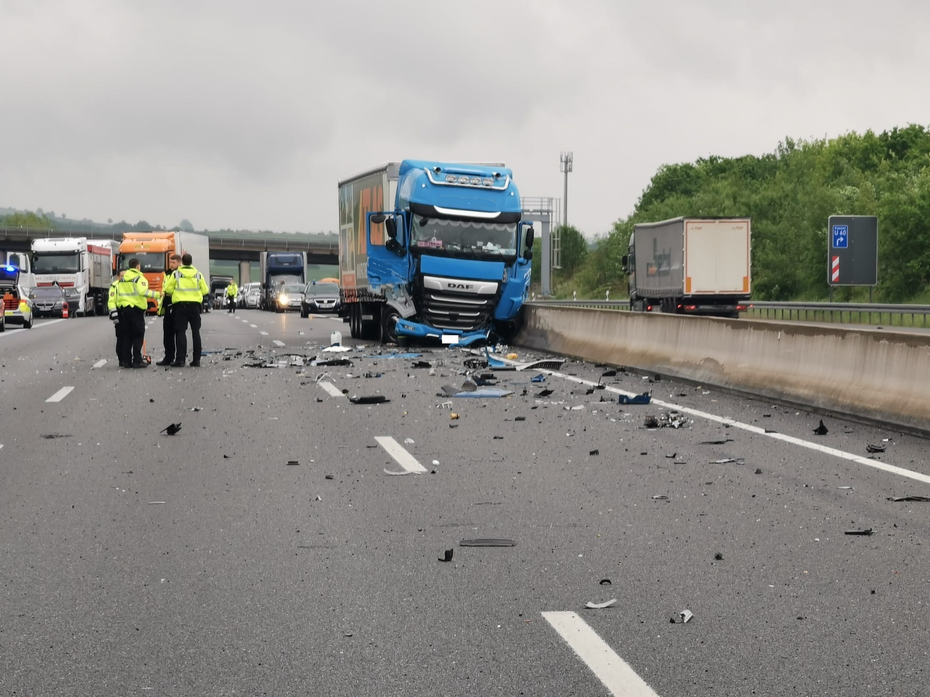 Ein Lkw fuhr auf dem rechten Fahrstreifen, als sein linker Reifen platze. Der Lkw wurde hierdurch auf den linken Fahrstreifen gezogen, wo er mit einem weiteren Lkw kollidierte. Ein dahinter befindlicher Pkw überschlug sich und blieb auf der Seite liegen. Die beiden Insassen des Pkw wurden in ihrem Pkw einklemmt.