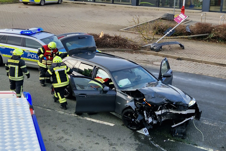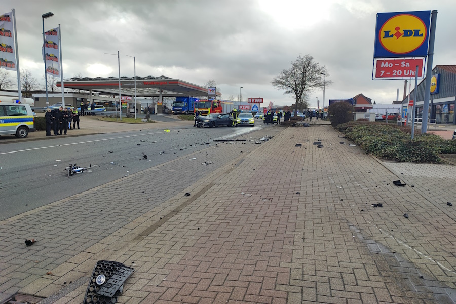 Die anrückenden Einsatzkräfte sahen bereits kurz vor der Einsatzstelle eine Vielzahl von Polizeikräften, die sich bereits vor Ort befanden. Die Einsatzstelle war übersäht von Trümmerteilen von zwei beteiligten und stark beschädigten Fahrzeugen. Auch ein Baum und ein Schild von einer sich vor dem Lidl-Markt befindlichen Bushaltestelle lagen umgestürzt auf dem Bürgersteig.