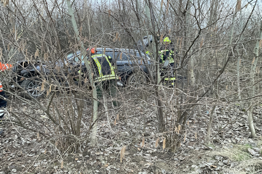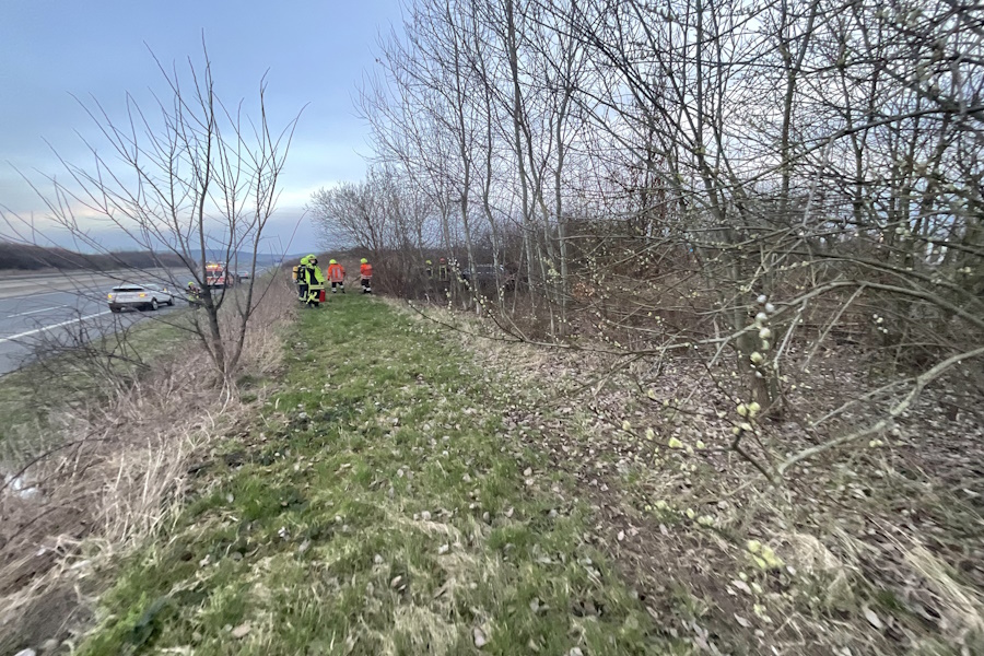 In Folge eines Reifenplatzers kam ein mit drei Insassen besetzer Pkw BMW auf der A7 kurz hinter der Abfahrt zur Raststätte Harz-Ost von der Fahrbahn ab, fuhr in die Böschung und kam nach circa 100 Meter in einem Bestand von jungen Bäumen zum Stehen. Mehrere dahinter fahrende Pkw hielten sofort auf dem Standstreifen an und setzen einen Notruf auf. Durch die Feuerwehr- und Rettungsleitstelle Goslar sind initial die Feuerwehren Seesen, Bornhausen, Rhüden und der Rettungsdienst um 06:57 Uhr mit dem Stichwort “VU einklemmte Person“ alarmiert worden.