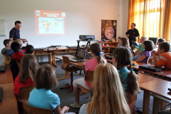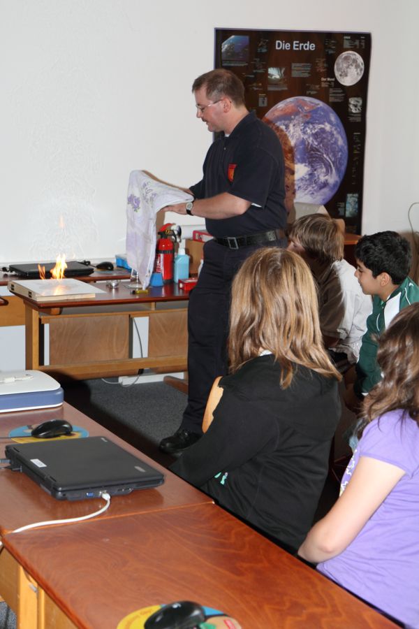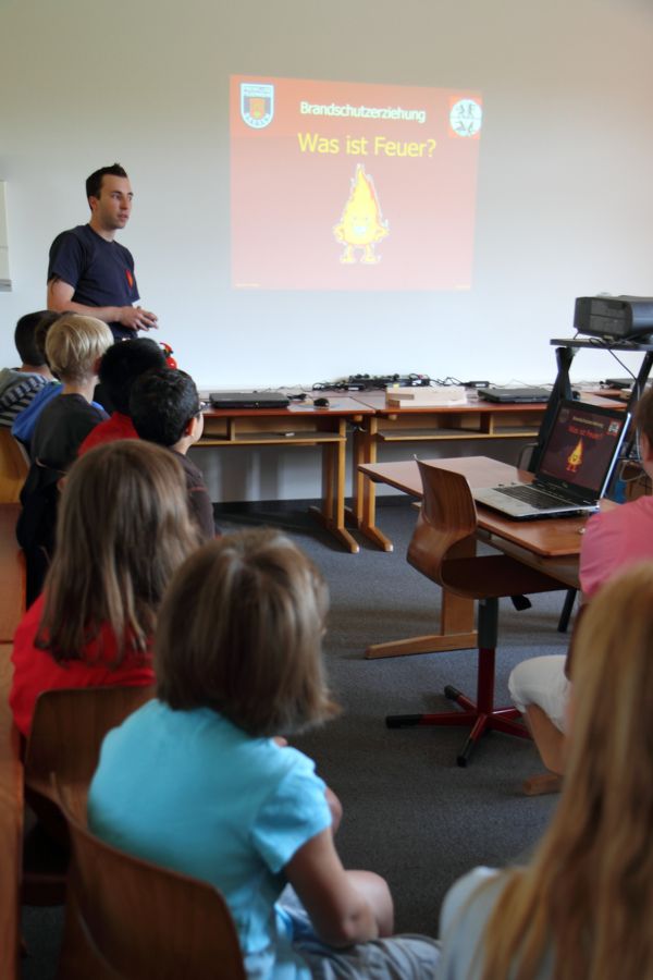 Auf die Frage vom Feuerwehrmann, warum Brandschutzerziehung wichtig ist, antwortet ein Schüler spontan: „ Damit man nicht einfach los rennt, wenn es brennt, sondern das Richtige macht!“ Und darum ging es im theoretischen Teil, mehr über die Gefährlichkeit des Feuers zu erlernen und auch bei den beeindruckenden Präsentationen von Stephan Marschall, zu sehen, was zu tun ist. Im Computerraum der Schule führten die Feuerwehrmänner vor, wie Feuer bekämpft und gelöscht kann und zeigten es sogleich mit einigen Vorführungen, darunter das Ersticken des Feuers, was auch mit einem Handtuch möglich ist sowie das traditionelle Löschen mit Wasser. Auch die Benutzung eines Feuerlöschers wurde erklärt und was zu tun ist, wenn die ersten Löschversuche fehl schlagen. „Wenn man bei der Entstehung des Feuers dabei ist, kann man eigene Löschversuche unternehmen, aber bitte nicht wenn man zu einem Brandherd erst dazu kommt, da geht das eigen Leben vor“ ermahnt Wagner die anwesenden Schüler. Wichtig in der Brandschutzerziehung ist auch, dass die Kinder die Angst vor der Feuerwehr verlieren. „Wenn die Feuerwehr kommt ist es sehr laut, wir sehen mit unserer Kleidung und Atemschutzmaske sicher auch komisch aus, sprechen laut und die Stimme klingt verfremdet, aber ihr dürft keine Angst vor uns haben und euch verstecken!“, fährt er fort. Kinder neigen dazu, sich in Gefahrensituationen zu verstecken und genau das Gegenteil soll der Fall werden. Kinder sollen sich bemerkbar machen, wenn sie das Kinderzimmer nicht mehr verlassen können, notfalls auch Kuscheltiere aus dem Fenster werfen, Hauptsache die anrückende Feuerwehr merkt, dass Kinder in Gefahr sind.