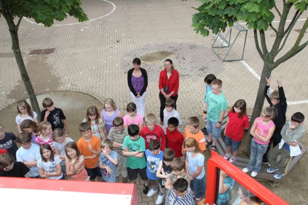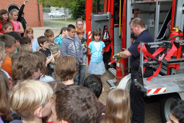 Feuer soll jedoch nicht zum „Schreckgespenst“ werden, aus diesem Grund wurde Feuer nicht nur als „böse“ dargestellt, denn schließlich spendet Feuer Wärme, gibt uns Energie und bei der Zubereitung von Speisen ist Hitze und Feuer unverzichtbar. Nach der Schulpause ging es auf den Schulhof zum Löschgruppenfahrzeug. Hier wurde die mitgeführte Ausrüstung erklärt und gleich Live vorgeführt. So lernten die Grundschüler an diesem Tage vieles über die Feuerwehr, Feuer und erfuhren mehr über das richtige Verhalten im Brandfall sowie dem Absetzen eines Notrufes.