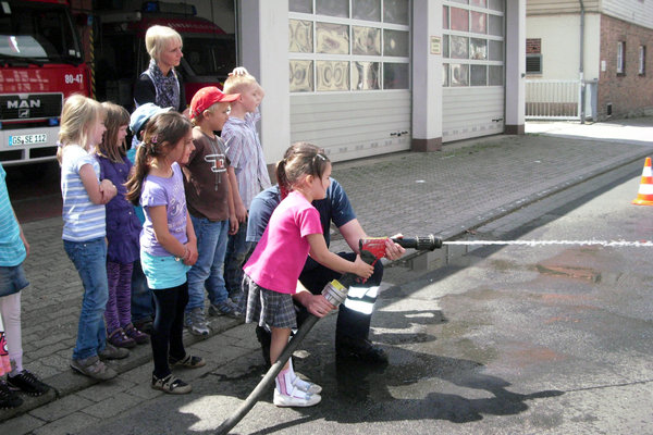 Nur einen Tag später kamen dann die „größeren Kinder“, die dieses Jahr in die Schule kommen, auf ihre Kosten. Sie besuchten die beiden Brandschützer in der Seesener Feuerwache, um zu sehen, was die Feuerwehr Seesen zur Bewältigung ihrer Aufgaben alles an Fahrzeugen und Werkzeugen vorhält. Am Ende des informativen Tages durften die Kinder das kühle Nass auf „Hütchen“ spritzen und damit spielerisch den lehrreichen Tag beenden.