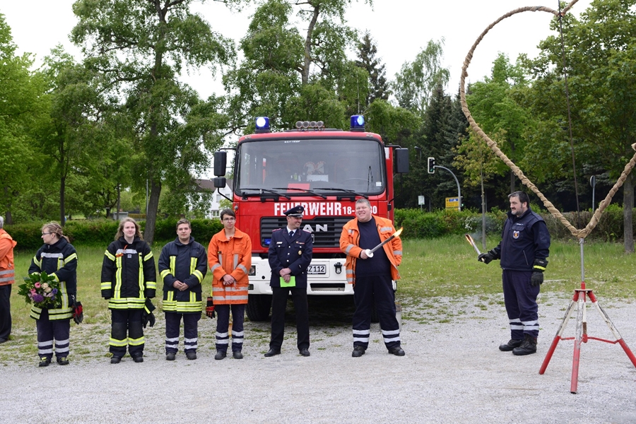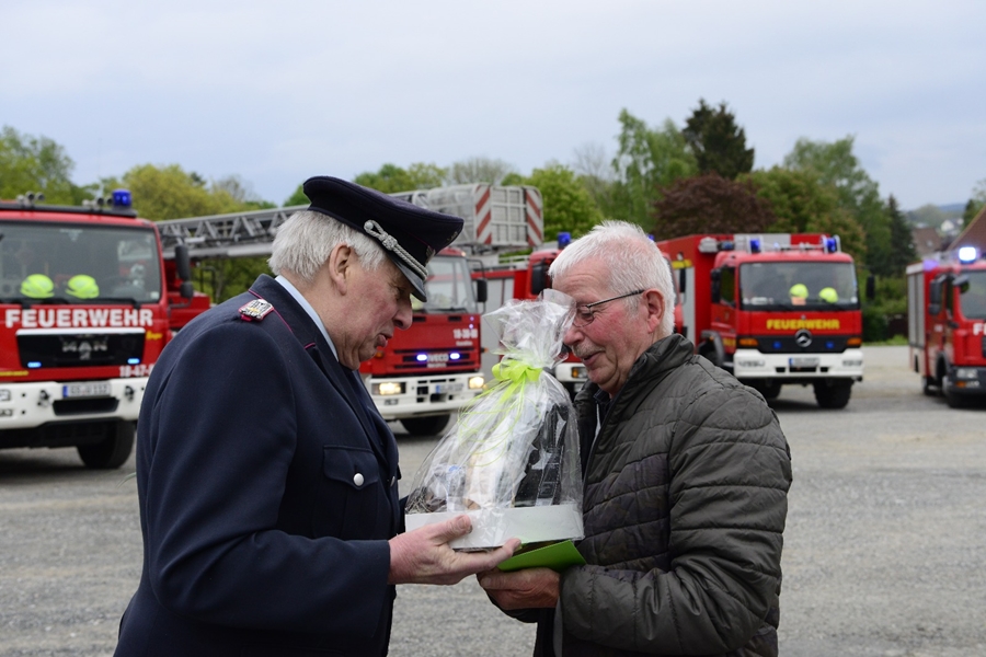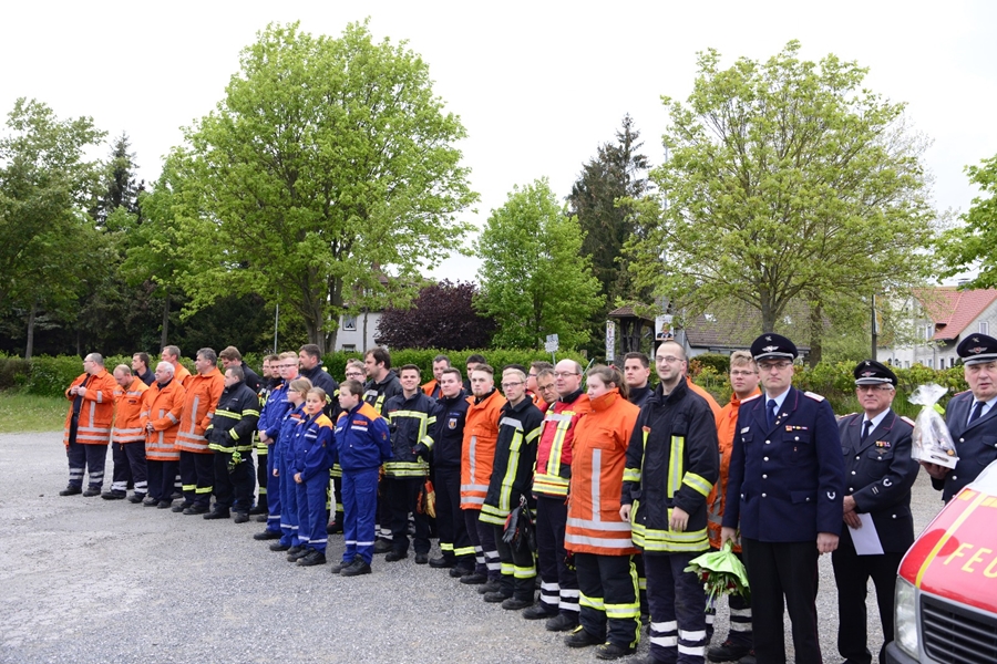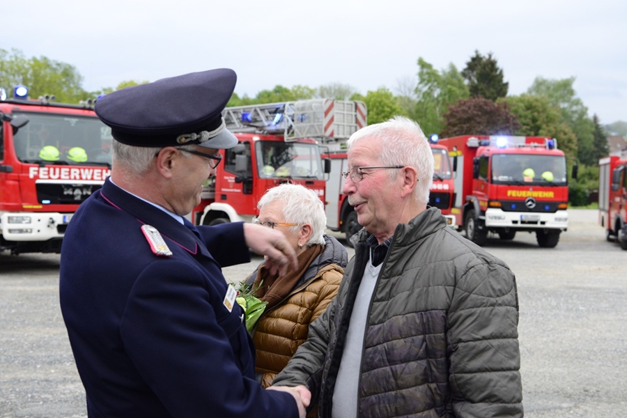 Neben Mitgliedern seiner ehemaligen Gruppe vom "Tanklöschfahrzeug" waren an diesem Abend auch viele Mitglieder aus dem 2. Zug und der Jugendfeuerwehr auf dem Schützenplatz angetreten. Hoch erfreut und sichtlich bewegt, vorbei an den aufgestellten Einsatzfahrzeugen und nach abschreiten der Formation, nahmen die beiden den Gratulationsreigen entgegen. Neben seiner ehemaligen Gruppe mit Gruppenführer Marcel Euler, dem Ortsbrandmeister Thomas Bettner und dessen Stellvertreter Thomas Kohlstedt, der Jugendfeuerwehr mit Jugendwart Christioph Sachse, dem Vertreter der Alters-und Ehrenabteilung Dieter Hannemann, reite sich auch der stellvertretende Stadtbrandmeisten Klaus Kiehne bei den Gratulanten ein.