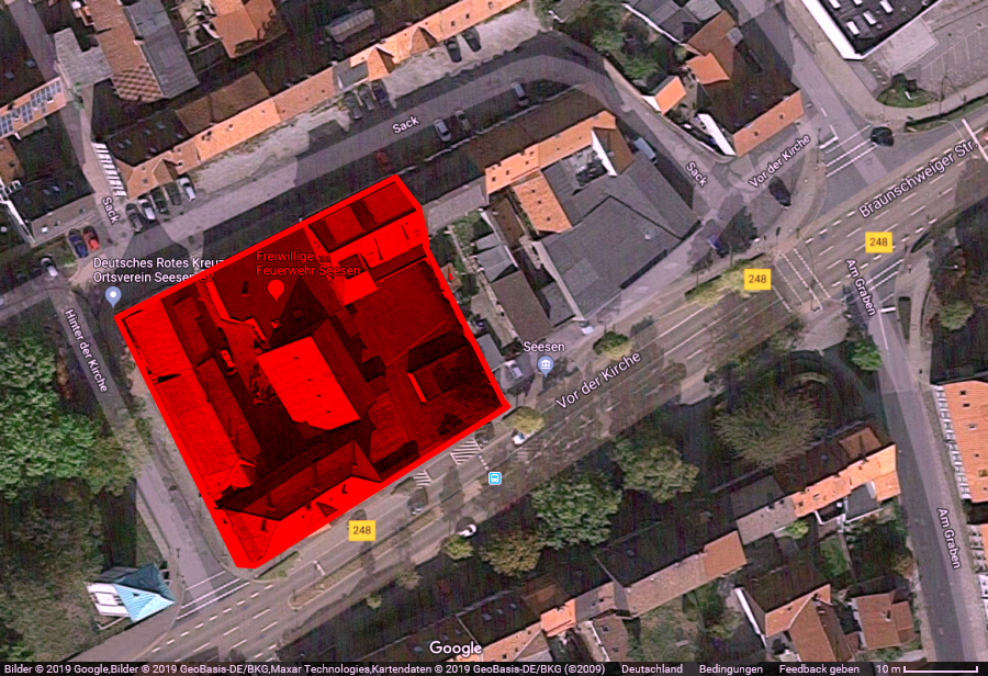 Die Pläne für den Neubau der Seesener Feuerwehrwache am aktuellen Standort beinhalten den rot markierten Bereich. Hinzu kommen sollen bereits bebaute und unter Denkmalschutz stehende Flächen die an die Straßen "Vor der Kirche" und "Hinter der Kirche" grenzen.