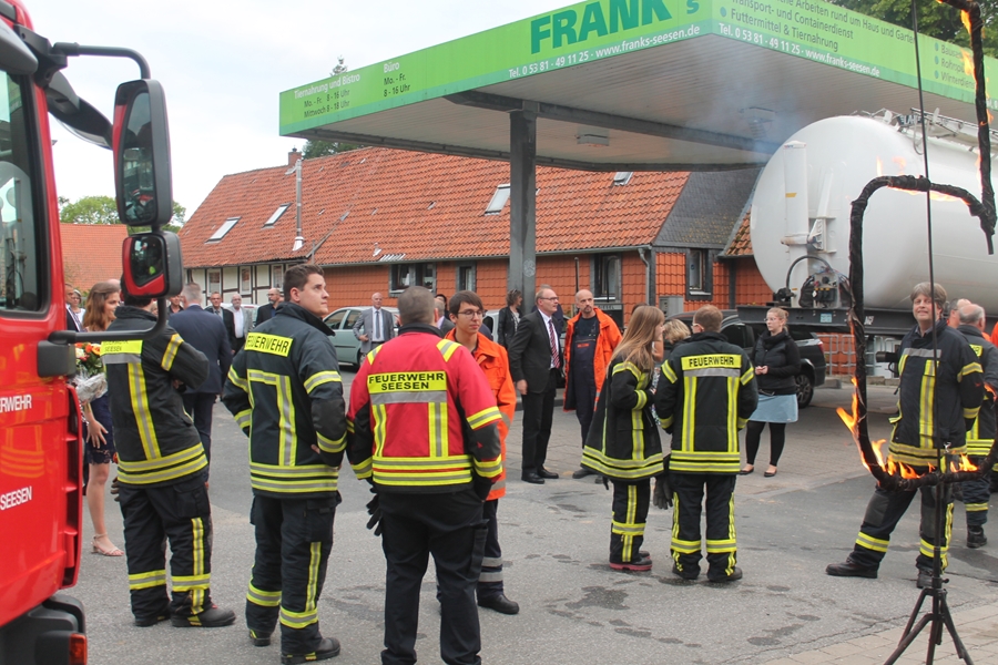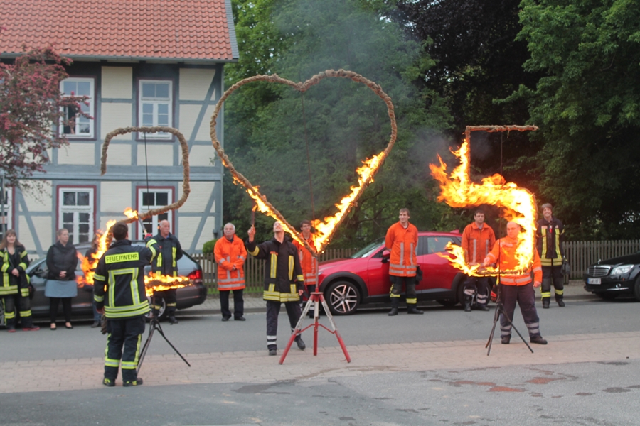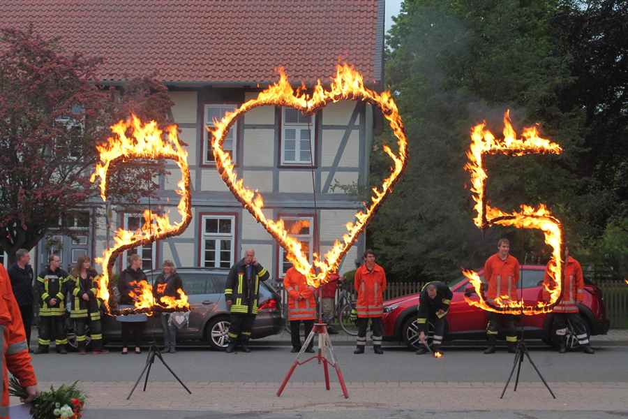 Neben den Gruppenmitgliedern vom LF 8 hatten sich weitere Kameraden aus den Reihen der Feuerwehr Seesen an den Ort der Feier begeben, um dem Jubelpaar zu gratulieren. Nach dem Entzünden der Feuerschrift, bestehend aus einem brennenden Herzen, welches von der Zahl 25 flankiert wurde, konnte das Silberpaar vom stellvertretenden Zugführer Olaf Groth und Gruppenführer Torsten Probst die besten Wünsche für die weitere gemeinsame Zukunft entgegen nehmen.