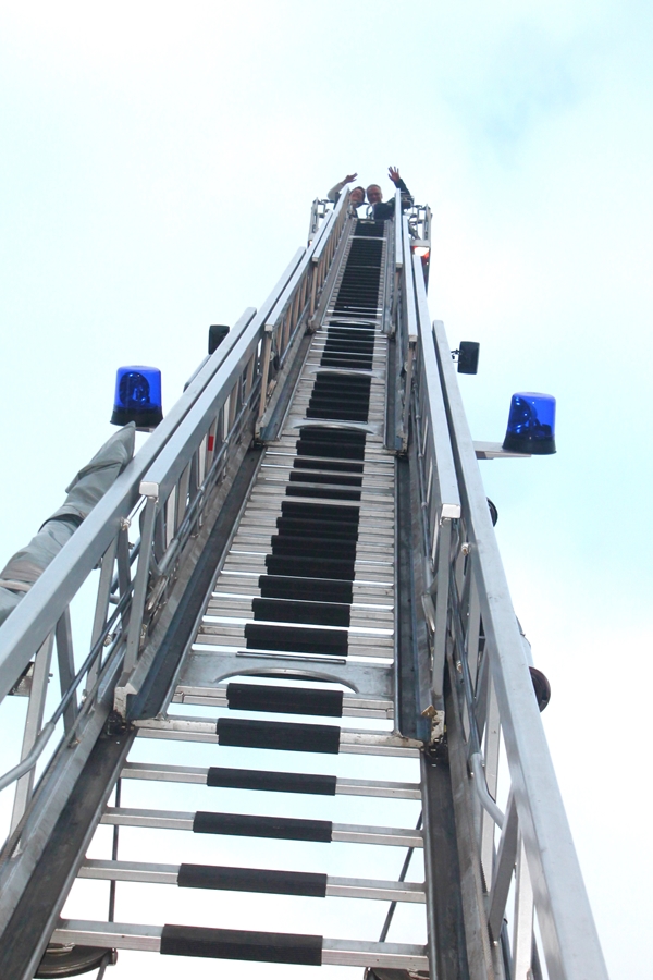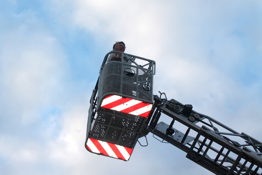 Nach dem Gratulationsreigen der anwesenden Kameradinnen und Kameraden ging es für das Ehepaar Bettner nun in den Korb der Drehleiter. Anderst wie sonst steuerte nicht Thomas den Korb des Fahrzeug, dass übernahm an diesen besonderen Tag seine Frau Simone. Vom Ortsbrandmeister gab es wohl über diese exklusive Fahrt auch kein Wort des Tadels.