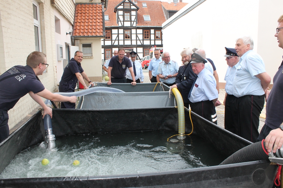 Es folgten ein paar Worte der Erläuterung zum ehemaligen Löschbezirk. Der damalige Löschbezirk des Unterkreises 5 im ehemaligen Landkreis Gandersheim endete mit der Gebiets- und Verwaltungsreform im Jahre 1974. Ein Stück Feuerwehrgeschichte fand ein jähes Ende. Heute würde kaum noch jemand über diese geschichtliche Vergangenheit sprechen, wenn nicht der damalige Ortsbrandmeister der Ortsfeuerwehr Herrhausen, Walter Reichardt den Vorschlag 1984 unterbreitet hätte, diesen Löschbezirk im Stadtgebiet Seesen aufrecht zu erhalten. Nicht offiziell, aber um die Kameradschaft zu fördern, wollte man sich jährlich einmal treffen. Eine Übung im Wechsel der fünf Ortsfeuerwehren Seesen, Kirchberg, Herrhausen, Ildehausen und Münchehof.