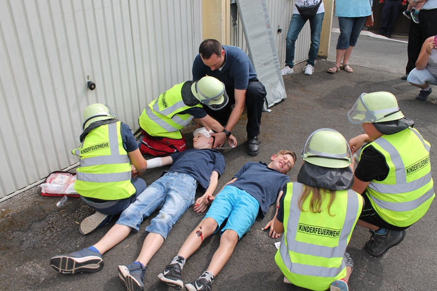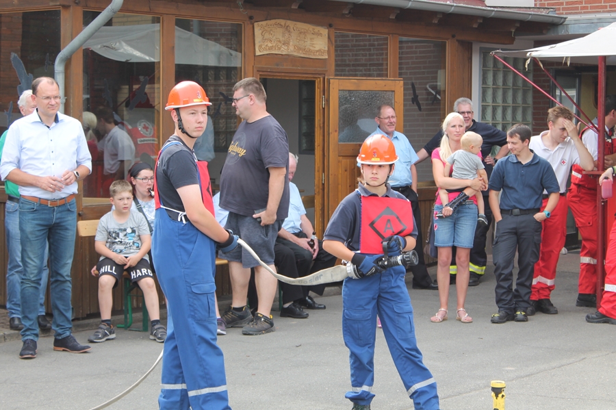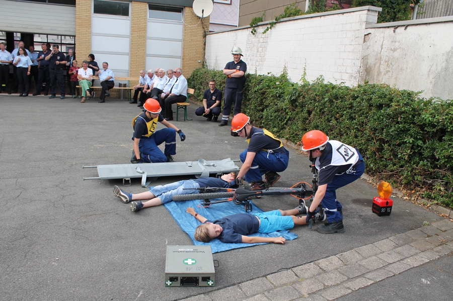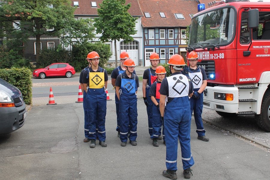 Nachdem alle Gruppen die verschiedenen Stationen passiert hatte, stellte die Jugendfeuerwehr Seesen zusammen mit der Kinderfeuerwehr eine Übung vor. Es galt, Verletzte zu retten und im Anschluss an den Rettungsdienst zu übergeben, zeitgleich galt es den Brandschutz sicherzustellen. Jugendfeuerwehrwart Christoph Sachse kommentierte die Übung und erklärte, was die Jugendlichen im Einzelnen machen. Die zahlreichen Zuschauer konnten sich vom Können der Nachwuchsbrandschützer überzeugen.