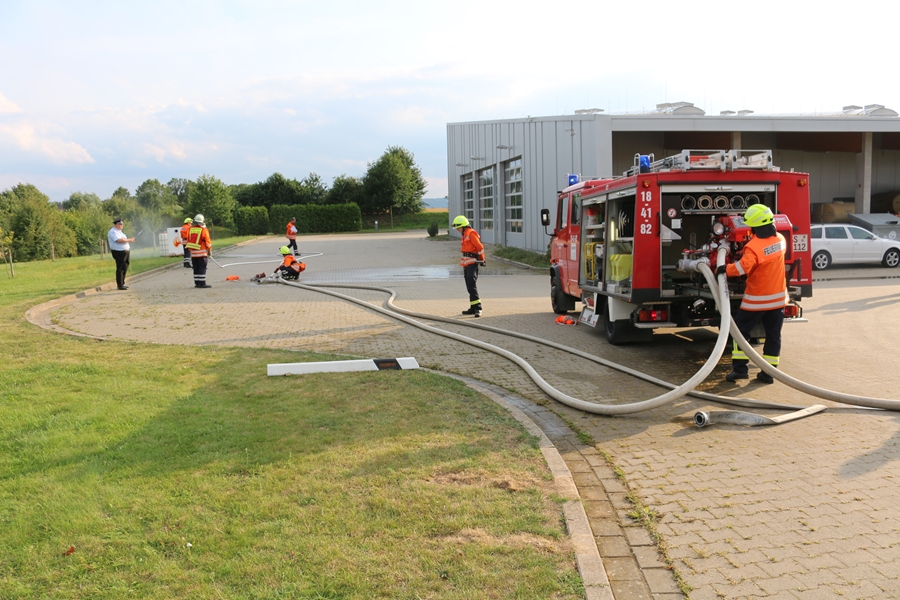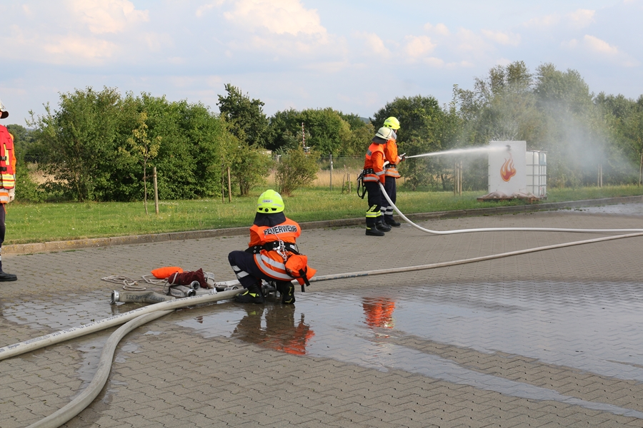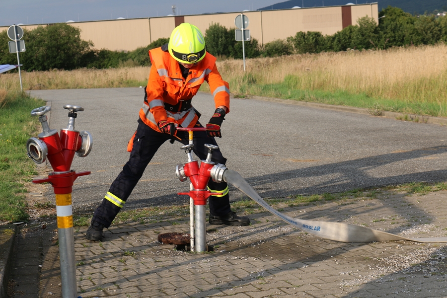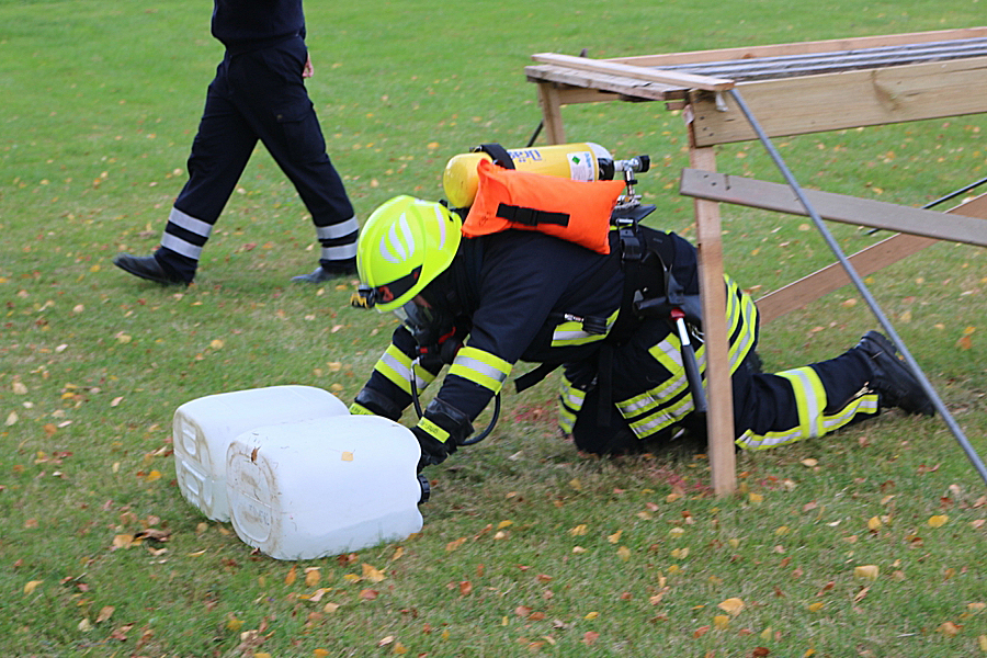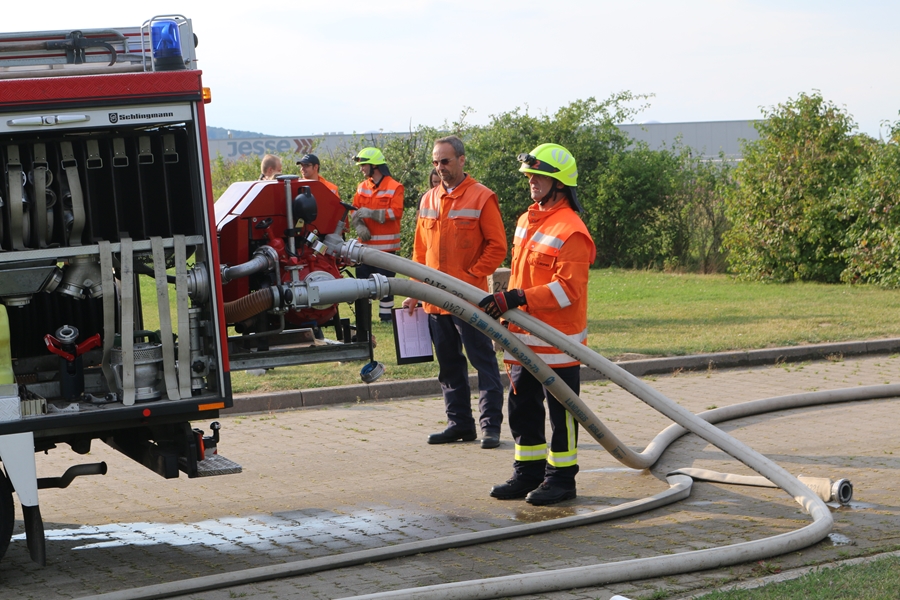 Simuliert wurde hier beispielsweise ein Containerbrand. Hier musste unter anderen die Wasserversorgung von einer Feuerlöschkreiselpumpe hergestellt und ein IBC-Container zunächst mit 100-Liter-Wasser gefüllt werden. Es folgte ein simulierter Schlauchdefekt, dass heißt, den alten Schlauch entfernen, einen neuen Schlauch anschließen, um dann weitere 100-Liter-Wasser in den IBC füllen.