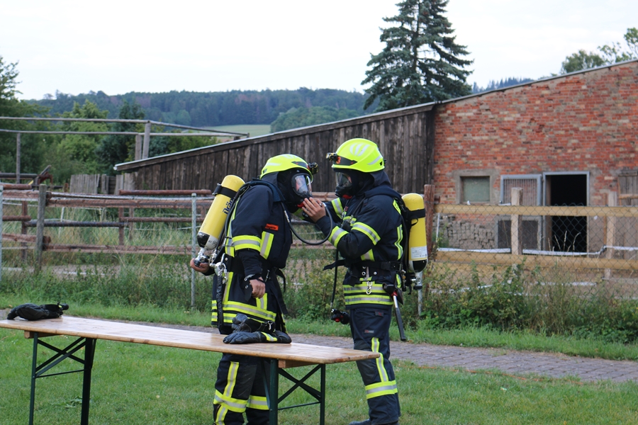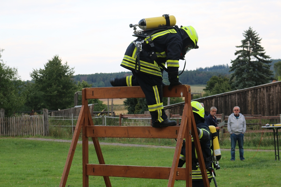 Das Herstellen der Einsatzbereitschaft eines Trupps unter Atemschutz und das Erbringen einer körperlichen Belastungsübung gemäß FwDV 7 war ebenfalls Gegenstand der Leistungsüberprüfung. Es soll der sichere Umgang mit dem Pressluftatmer sowie das zeitoptimierte Anlegen des Atemschutzgerätes (Atemanschluss und Luftversorgungssystem) gezeigt werden. Auch die ordnungsgemäße Dokumentation nach FwDV 7 ist Teil der Aufgabe. Der Atemschutztrupp führt eine Kurzprüfung am Pressluftatmer durch, legt Atemanschluss und Pressluftatmer an, meldet sich bei der Atemschutzüberwachung an und absolviert die Belastungsübung. Diese besteht aus der Aufnahme von 2 Kanistern je Truppmitglied, Überwinden einer Leiterwand, Durchkriechen einer Engstelle, Meldung bei der ASÜ bei Erreichen einer Wurfstelle, Kraftkoordinationswerfen (je Mitglied zwei Wurf), Rückweg in umgekehrter Reihenfolge und Abmeldung bei der Atemschutzüberwachung nach Überschreiten der Grundlinie.